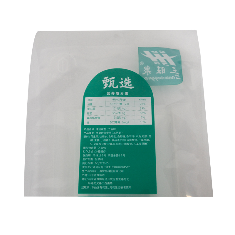 This 270×190×12.5 mm stand-up pouch is engineered for liquid or semi-liquid food products, particularly marinated fresh peanuts.The PA (Nylon)/RCPP structure ensures superior barrier properties, making it ideal for vacuum-sealed or pasteurized packaging. High Barrier Protection: Prevents oxygen and moisture ingress, preserving freshness. Heat :Suitable for retort processing (high-temperature sterilization). Leak-Proof Design: Prevents liquid seepage, maintaining product integrity.